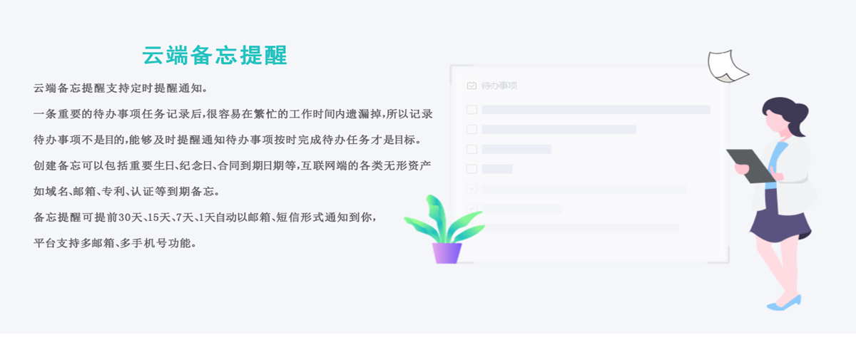 ●备忘提醒可提前30天、15天、7天、1天、过期1天自动以邮箱、短信形式通知到你;●频次可设置为指定日期、每年、每月进行统计推送;●支持阴历日期;●平台支持钉钉、企业微信群消息提醒;●每日8:15精准推送提醒信息;